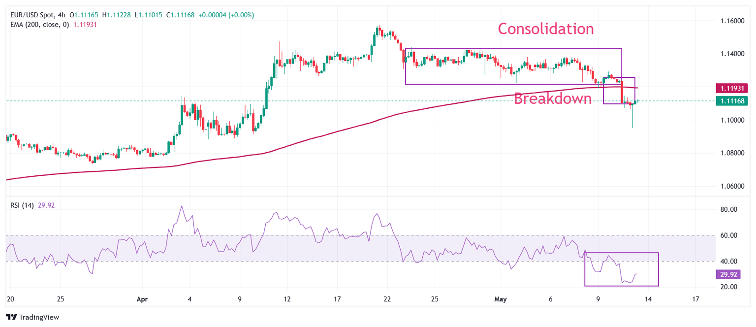 El EUR/USD gana terreno temporalmente por debajo de 1.1100 el martes tras un fuerte desplome el día anterior. El par se desplomó el lunes tras una ruptura del rango de 1.1200-1.1440 formado en los 20 días de negociación anteriores. El par de divisas principal extiende su movimiento a la baja por debajo de la Media Móvil Exponencial (EMA) de 200 períodos, que está alrededor de 1.1200, indicando una tendencia bajista.