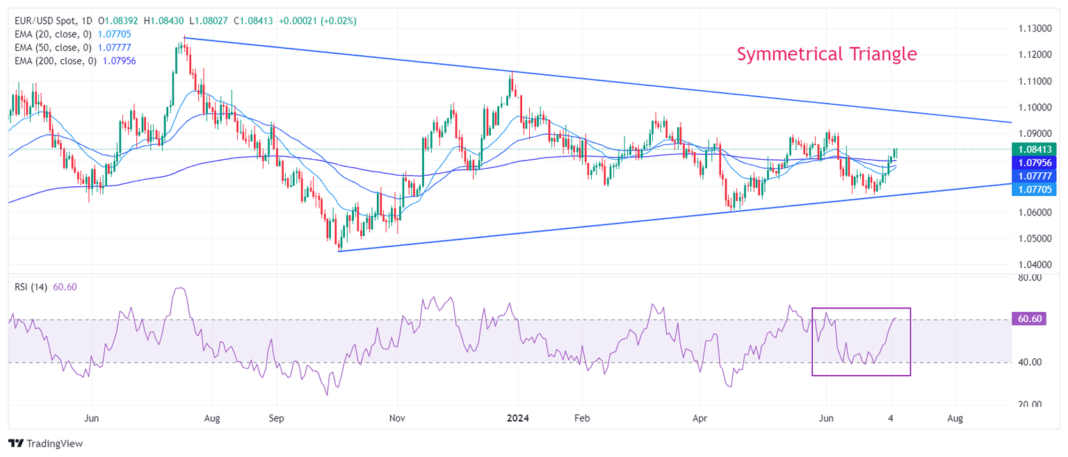 El EUR/USD gana terreno por encima de 1.0800. El par de divisas principal se fortalece después de estabilizarse por encima de las EMAs de 20 y 50 días, que cotizan alrededor de 1.0750 y 1.0770, respectivamente. La tendencia general del par de divisas compartido también se ha fortalecido ya que ha saltado por encima de la EMA de 200 días, que cotiza alrededor de 1.0800.