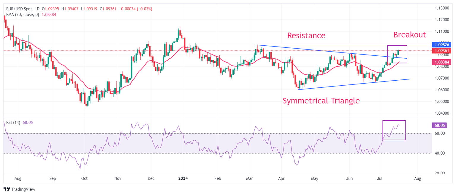El EUR/USD cae cerca de 1.0920 y se mantiene dentro del rango de negociación del miércoles antes de la reunión de política monetaria del BCE. El par de divisas principal se mantiene firme después de una ruptura de la formación de Triángulo Simétrico en un marco de tiempo diario. Una ruptura del patrón de gráfico mencionado resulta en ticks más amplios y un volumen pesado.