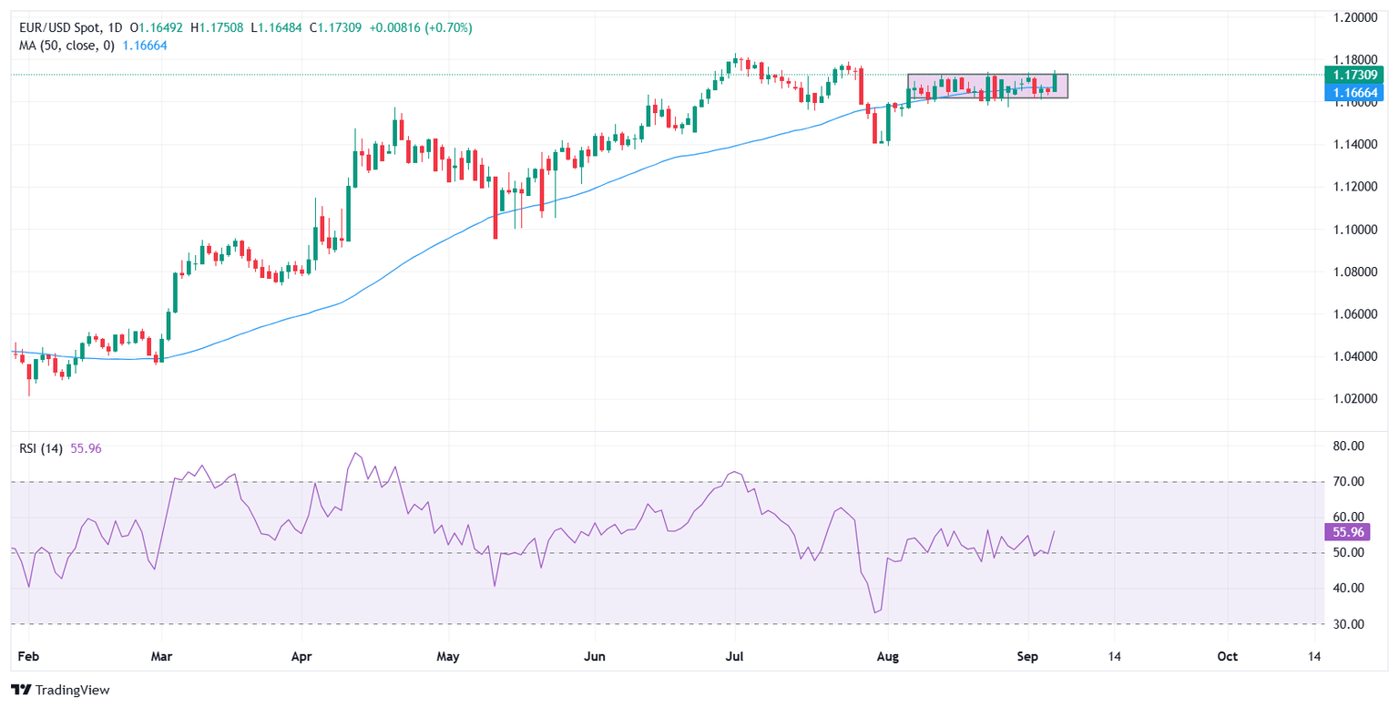 Mientras tanto, el EUR/USD también está probando el extremo superior de su rango reciente cerca de 1.1730. Una ruptura por encima de este nivel podría abrir el camino hacia el máximo del 24 de julio en 1.1789, mientras que el soporte inmediato se observa en 1.1700 y la SMA de 50 días en 1.1666.