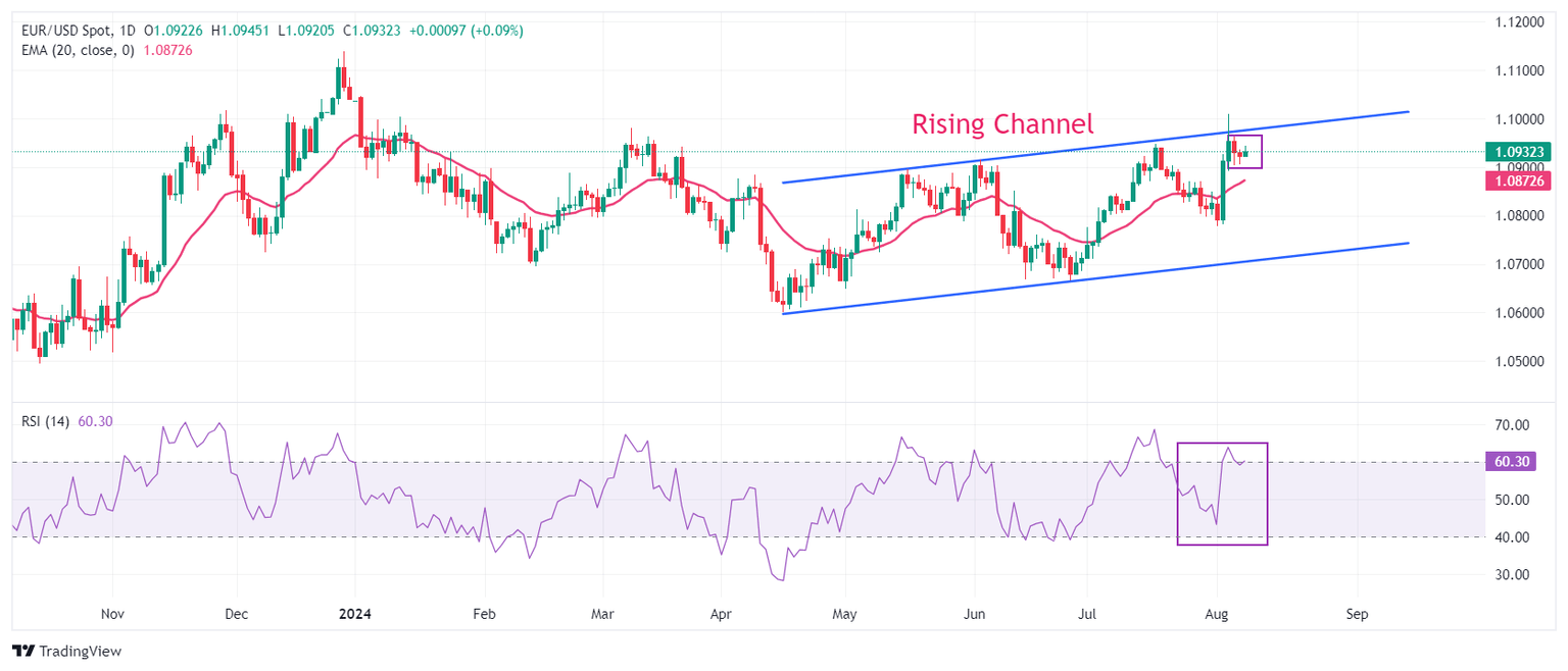 EUR/USD se mantiene cerca del límite superior de una formación de canal en un marco de tiempo diario. Una ruptura del patrón gráfico mencionado resulta en movimientos más amplios al alza y un volumen elevado. La media móvil exponencial (EMA) de 20 días, cerca de 1.0800, actuó como un soporte importante para los alcistas del Euro.