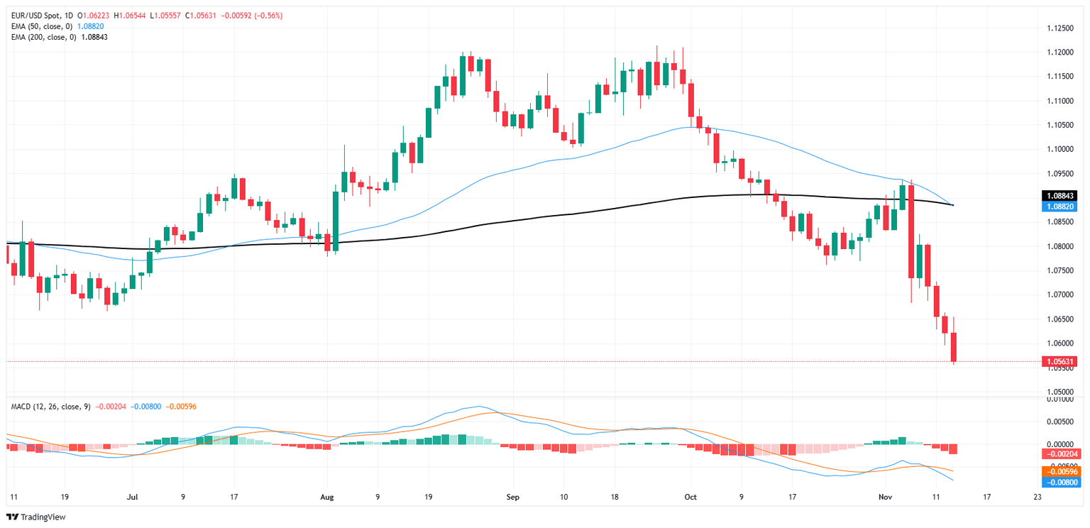 El EUR/USD continuó descendiendo el miércoles, alcanzando un mínimo de 54 semanas y situándose cerca de 1.0550. El par sigue perdiendo terreno en los gráficos mientras los mercados de divisas en general se inclinan por mantener el Dólar.