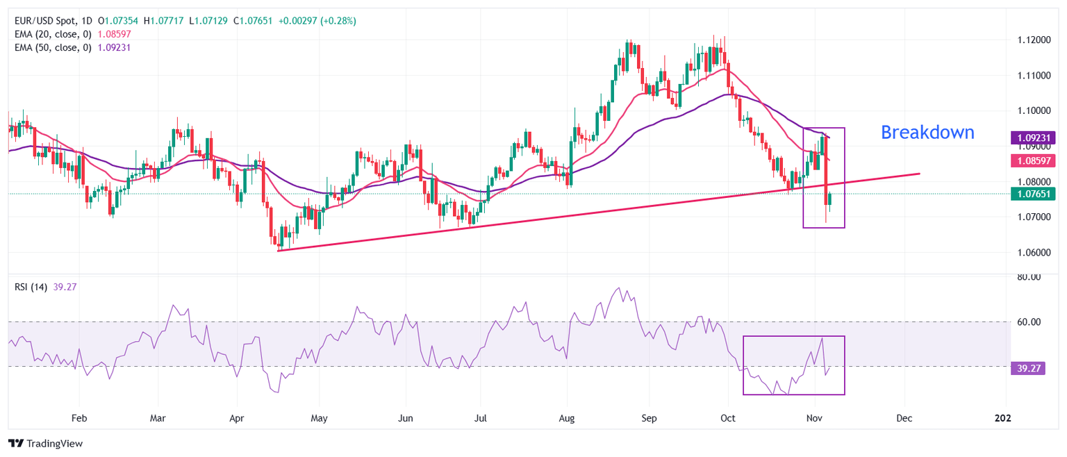 El EUR/USD rebota cerca de 1.0800 después de encontrar interés comprador por debajo del soporte clave de 1.0700. Sin embargo, la recuperación del par de divisas principal parece carecer de fuerza ya que las medias móviles exponenciales (EMAs) de 20 y 50 días en declive cerca de 1.0860 y 1.0920, respectivamente, sugieren una fuerte tendencia bajista.