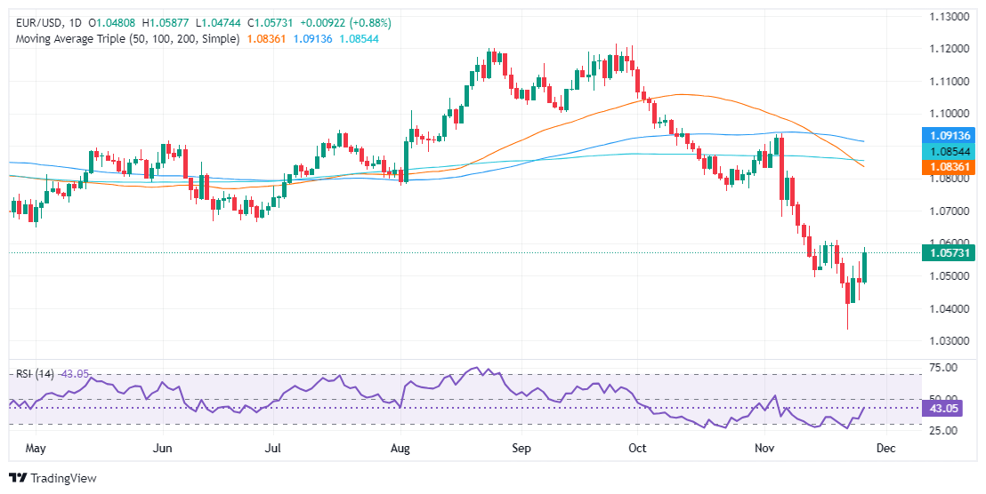 La tendencia bajista del EUR/USD sigue intacta, aunque la acción del precio durante los últimos tres días ha subido, una indicación de que no está encontrando aceptación en torno a la cifra de 1.03-1.04. Si el par extiende sus ganancias más allá del máximo del 20 de noviembre de 1.0609, los compradores podrían probar la cifra de 1.0700. De lo contrario, una caída por debajo de 1.0500 podría llevar a los bajistas a desafiar la marca de 1.0400.