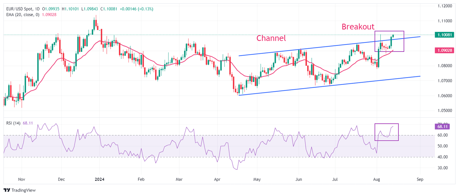 El EUR/USD marca un nuevo máximo de siete meses por encima de 1.1000. El par de divisas principal se fortalece después de una ruptura de la formación de Canal en un marco de tiempo diario. La media móvil exponencial (EMA) de 20 días con pendiente ascendente cerca de 1.0900 sugiere que la perspectiva a corto plazo del par de divisas compartido es alcista.