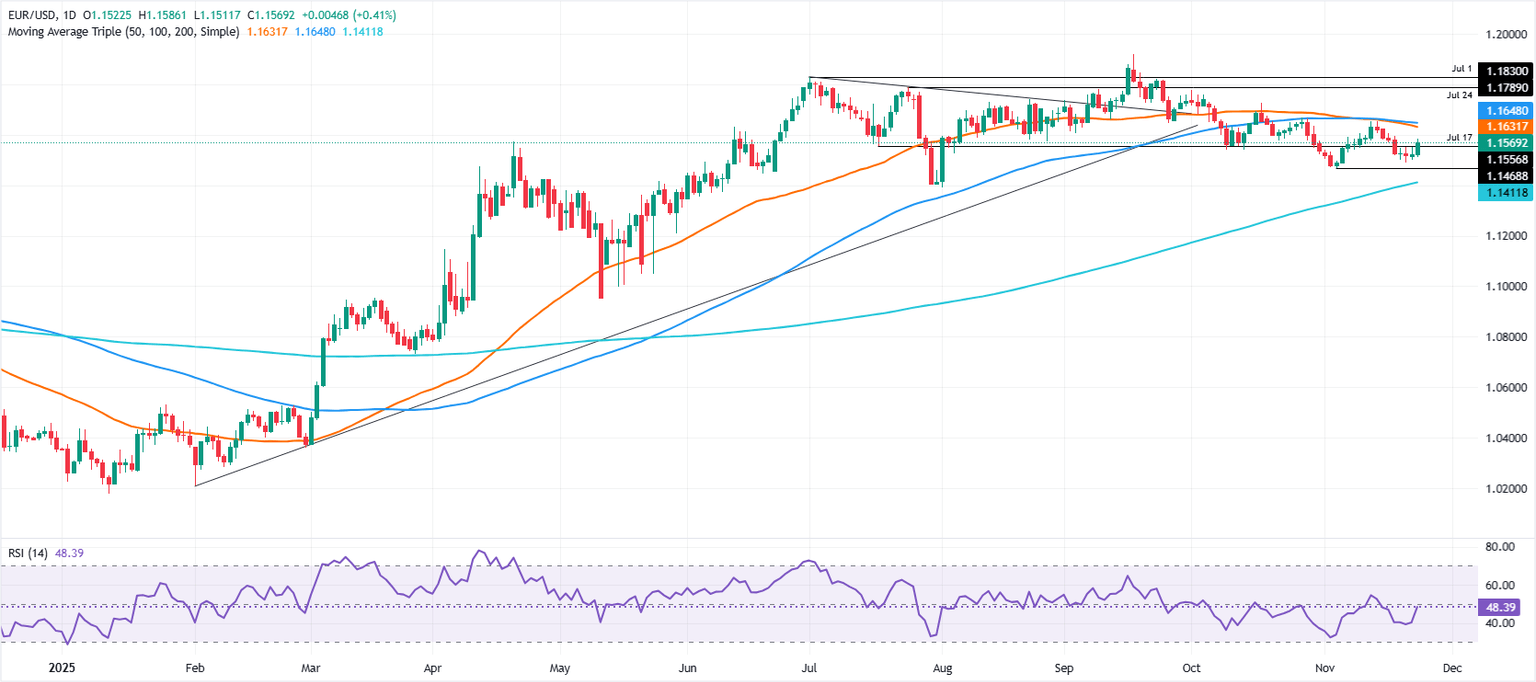 EUR/USD registra sólidas ganancias de más del 0.51% el martes, impulsado por un Dólar estadounidense más débil, ya que los datos reforzaron la especulación de los traders de que la Reserva Federal podría reducir las tasas en la reunión de diciembre. En el momento de escribir, el par se cotiza a 1.1579, acercándose a la cifra de 1.1600.