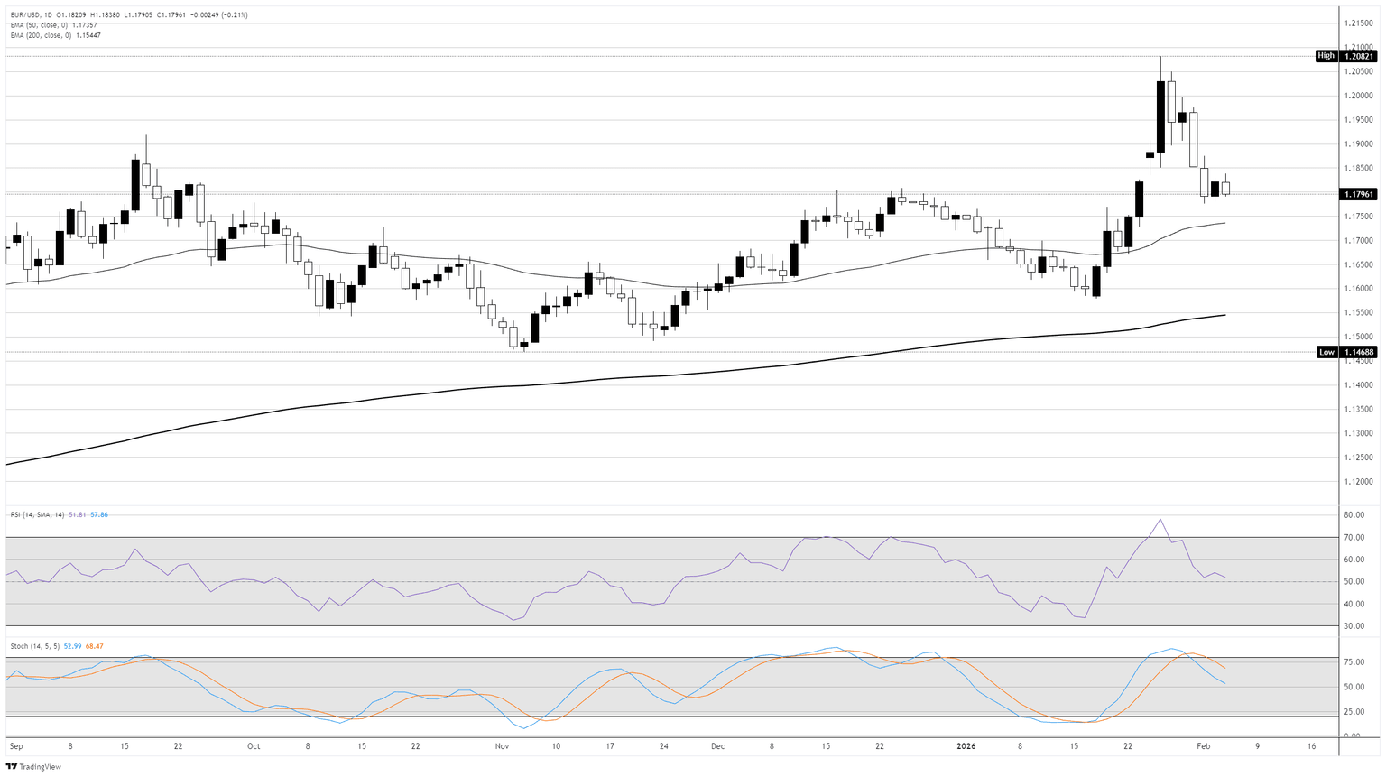 A pesar de un reciente breakout alcista, el EUR/USD se está consolidando dentro de un amplio rango lateral que ha definido la acción del precio desde mediados de 2025. El par se negocia por encima de las medias móviles exponenciales (EMA) de 50 y 200 días, con la EMA de 50 días cerca de 1.1740 y la EMA de 200 días alrededor de 1.1410. Esta alineación alcista confirma la tendencia alcista a medio plazo, aunque el ritmo de las ganancias se ha desacelerado a medida que el par se acerca a la resistencia psicológica cerca de 1.20.