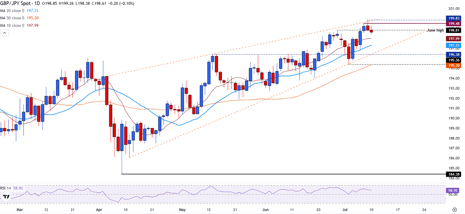 En el momento de escribir, el GBP/JPY se cotiza justo por debajo de 198.80 después de tocar brevemente el límite superior de un canal ascendente a principios de esta semana.