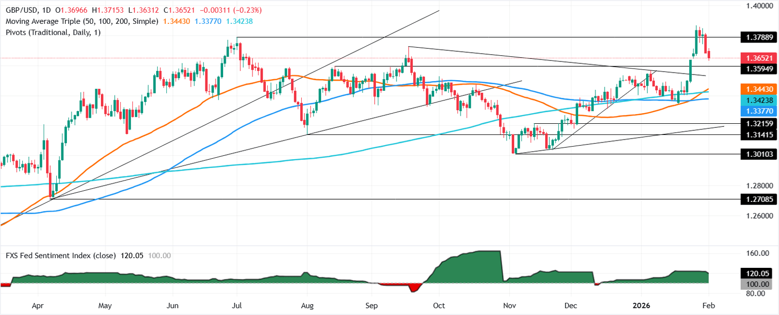 La Libra esterlina (GBP) se desploma un 0.17% el lunes mientras el Dólar estadounidense (USD) extiende sus ganancias a dos días consecutivos, tras la caída de los metales preciosos que empujó los precios del Oro por debajo de 1.000$ después de alcanzar un máximo histórico cercano a 5.600$. El GBP/USD cotiza en 1.3662 después de alcanzar un máximo diario de 1.3715.