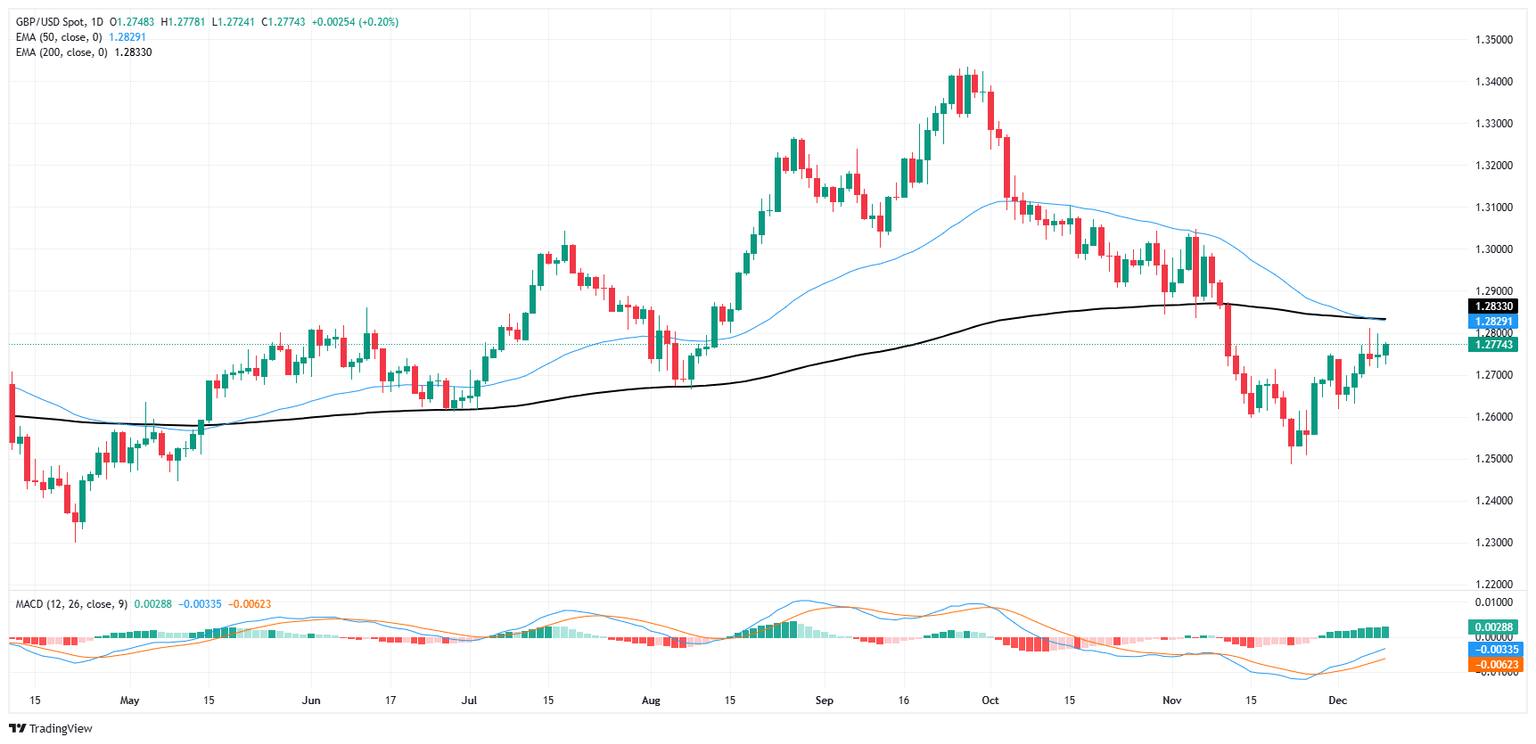 El GBP/USD está luchando con la agitación del gráfico a corto plazo cerca de la zona de 1.2800, con el par suspendido en una zona muerta justo al sur de la media móvil exponencial (EMA) de 200 días cerca de 1.2830. La acción del precio ha hecho una lenta y laboriosa recuperación después de tocar fondo cerca de 1.2500 a finales de noviembre, pero el impulso alcista está encontrando problemas y otra caída podría registrarse en el gráfico si la EMA de 200 días deja de ser un objetivo y se convierte en una barrera técnica difícil.