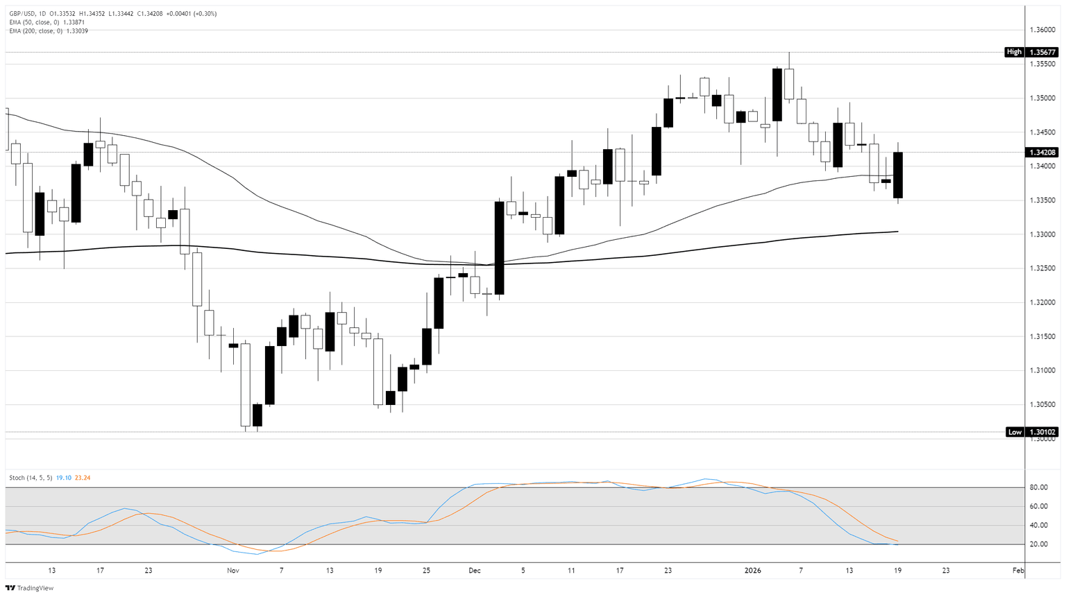 El rebote alcista a principios de semana del lunes ha dado al GBP/USD un nuevo punto de apoyo en el lado alto de la Media Móvil Exponencial (EMA) de 50 días justo por debajo de 1.3400, pero la acción del precio en general todavía se inclina hacia el lado bajista. El Cable ha estado en una lenta caída desde que falló en el nivel de 1.3550 a principios de enero, y el Oscilador Estocástico aún muestra algo de espacio para bajar a pesar de estar cerca de la barrera de sobreventa.