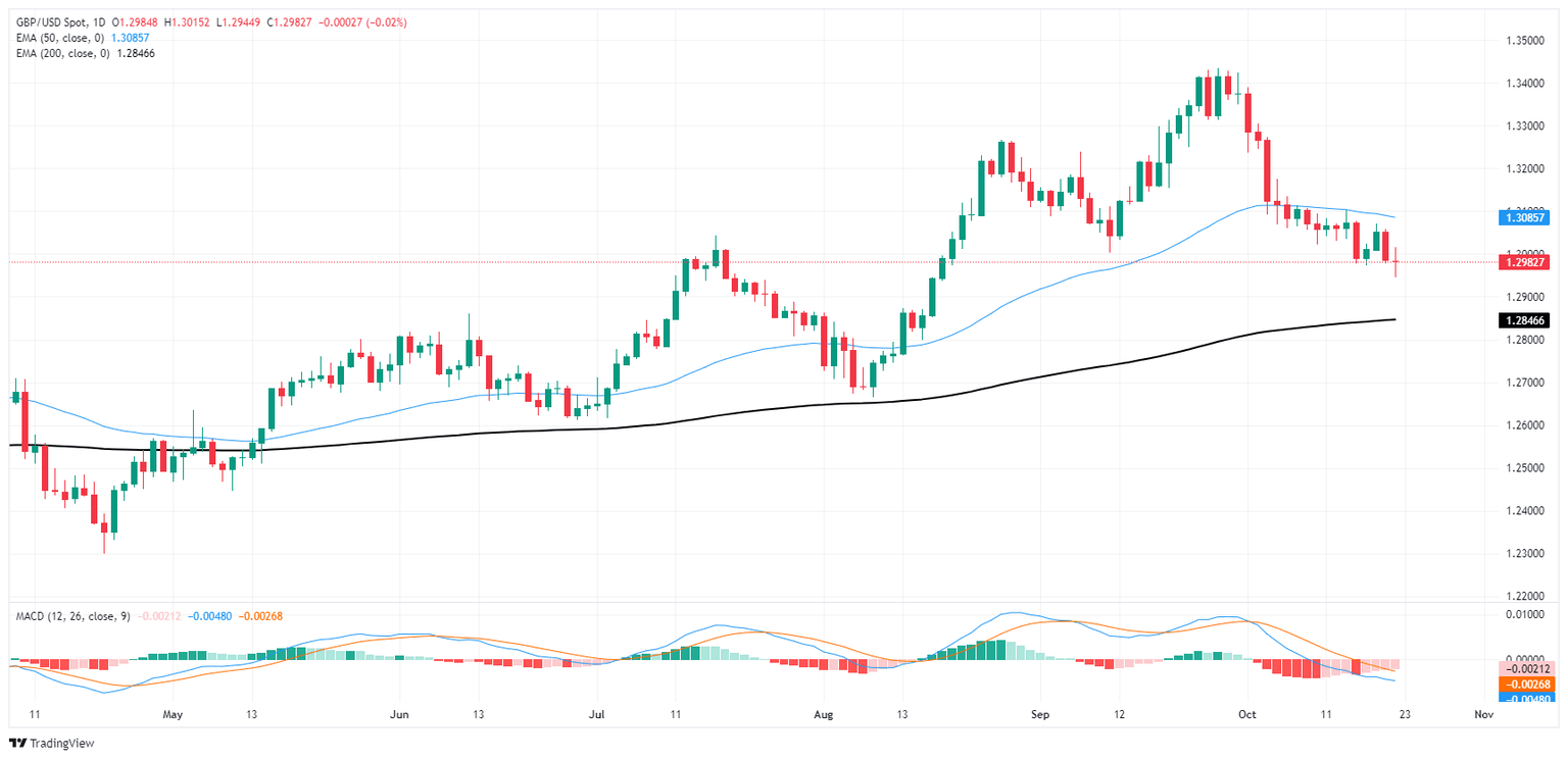 El par GBP/USD enfrenta una mayor presión de venta al deslizarse por debajo del nivel psicológico clave de 1.3000. El par se cotiza actualmente cerca de 1.2980, flotando justo por encima de la media móvil exponencial (EMA) de 200 días en 1.2846, que actúa como una zona de soporte crítico. La EMA de 50 días en 1.3085 está inclinada hacia abajo, lo que indica que la tendencia a corto plazo sigue siendo bajista. El impulso descendente desde los máximos de septiembre cerca de 1.3650 destaca un debilitamiento de la fuerza alcista, con máximos y mínimos más bajos formándose desde mediados de septiembre, lo que sugiere que los bajistas están actualmente en control.