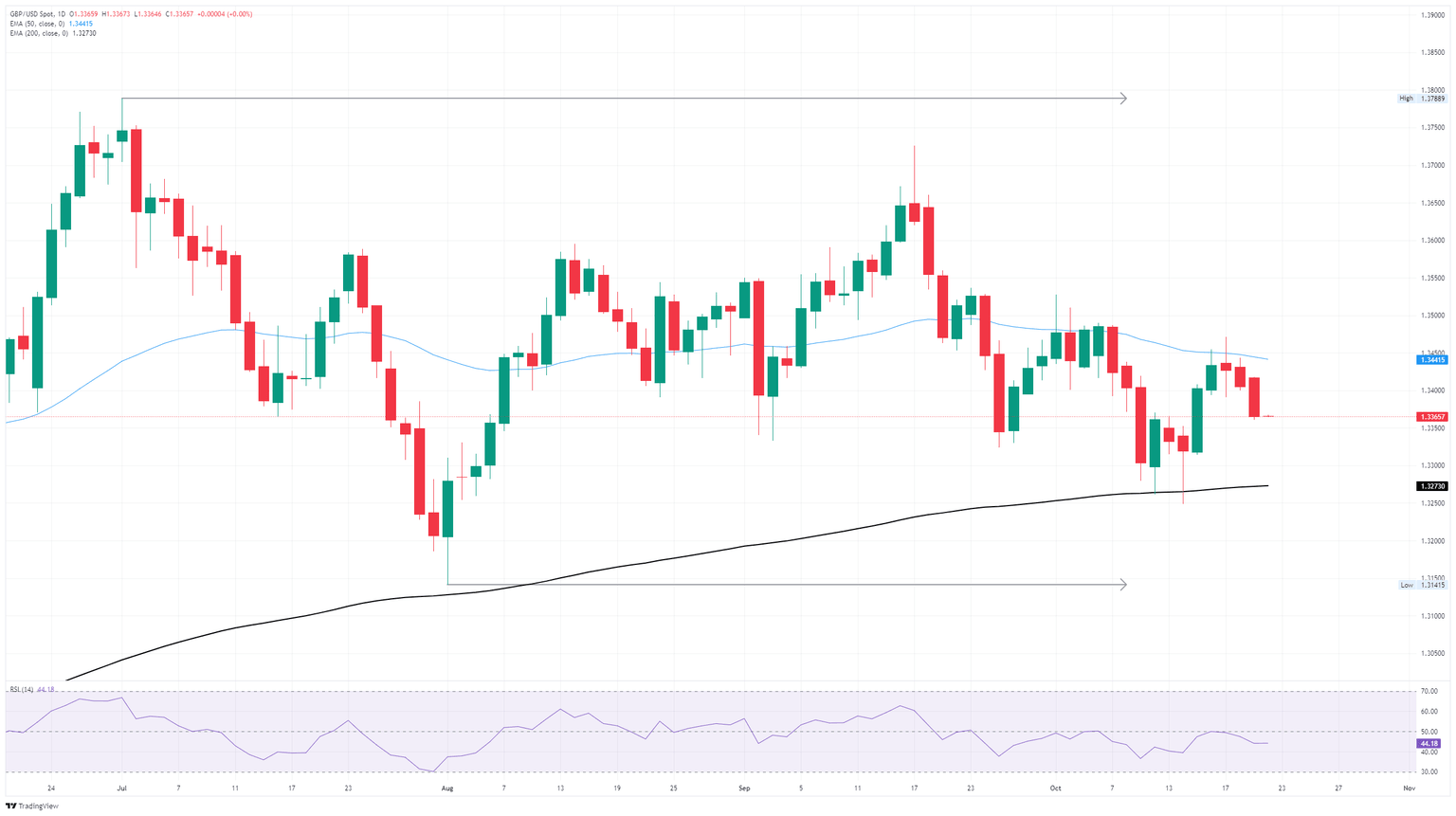 El gráfico diario del GBP/USD muestra que la libra británica cotiza alrededor de 1.3360, con la acción reciente del precio sugiriendo un período de consolidación tras una serie de máximos más bajos y mínimos más altos. El par sigue atrapado entre su media móvil exponencial (EMA) de 50 días cerca de 1.3440 y la EMA de 200 días alrededor de 1.3290, un rango que refleja la indecisión entre los operadores.