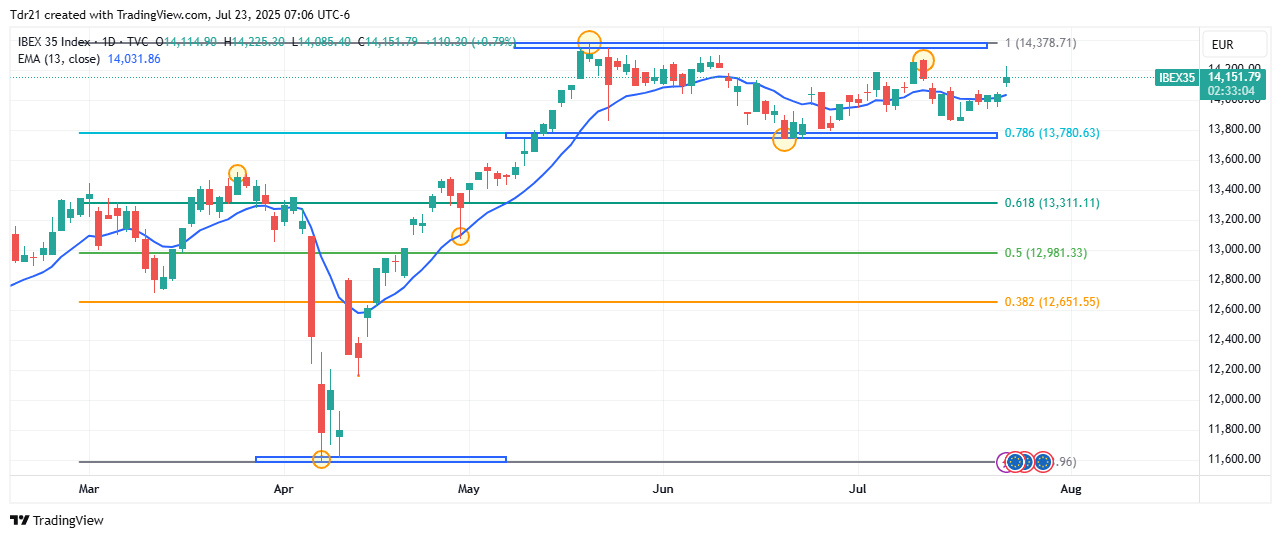 En este escenario, el Ibex 35 sube 113 puntos diario, operando actualmente en 14.155.