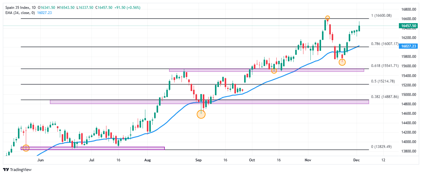 El Ibex 35 reaccionó al alza desde un soporte de corto plazo en 15.828, mínimo del 21 de noviembre. El siguiente soporte importante está en 15.488, punto pivote del 14 de octubre. Al norte, la resistencia más cercana se encuentra en 16.610, máximo del 13 de noviembre.