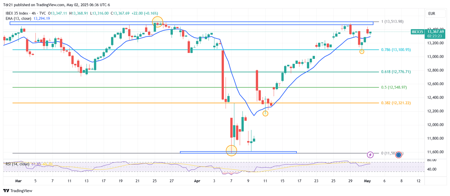 El Ibex 35 marcó un mínimo del día en 13.320, atrayendo compradores que impulsaron el índice a máximos del 29 de abril en 13.439. En estos momentos, el Ibex 35 cotiza sobre 13.355, subiendo un 0.55% en la última jornada de la semana.