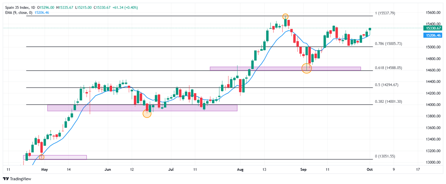 El Ibex 35 formó una resistencia de corto plazo en 15.538, punto pivote del 22 de agosto. Al sur, el soporte más próximo se encuentra en 14.591, mínimo del 2 de septiembre. El siguiente soporte clave está en 13.849, mínimo del 19 de junio, cercano al retroceso al 38.2% de Fibonacci.