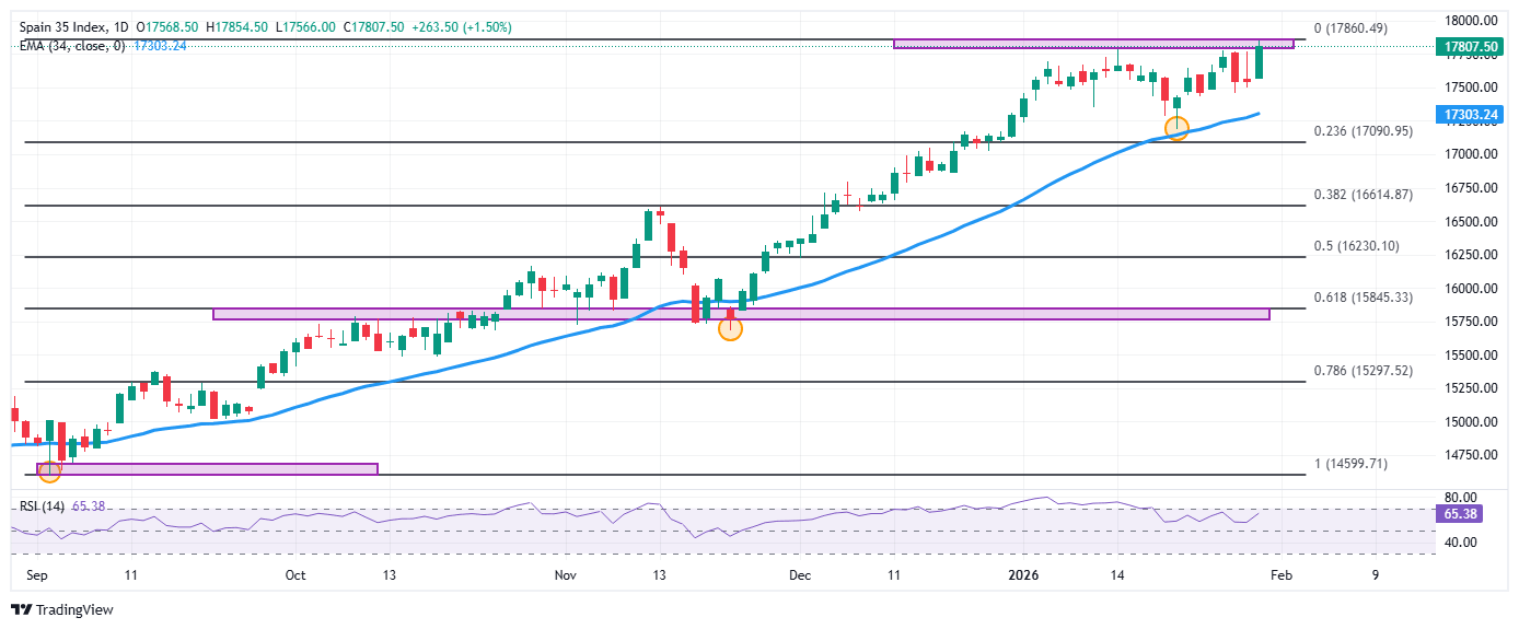 - El Ibex 35 gana un 1.70% diario, marcando nuevos máximos históricos en 17.854.