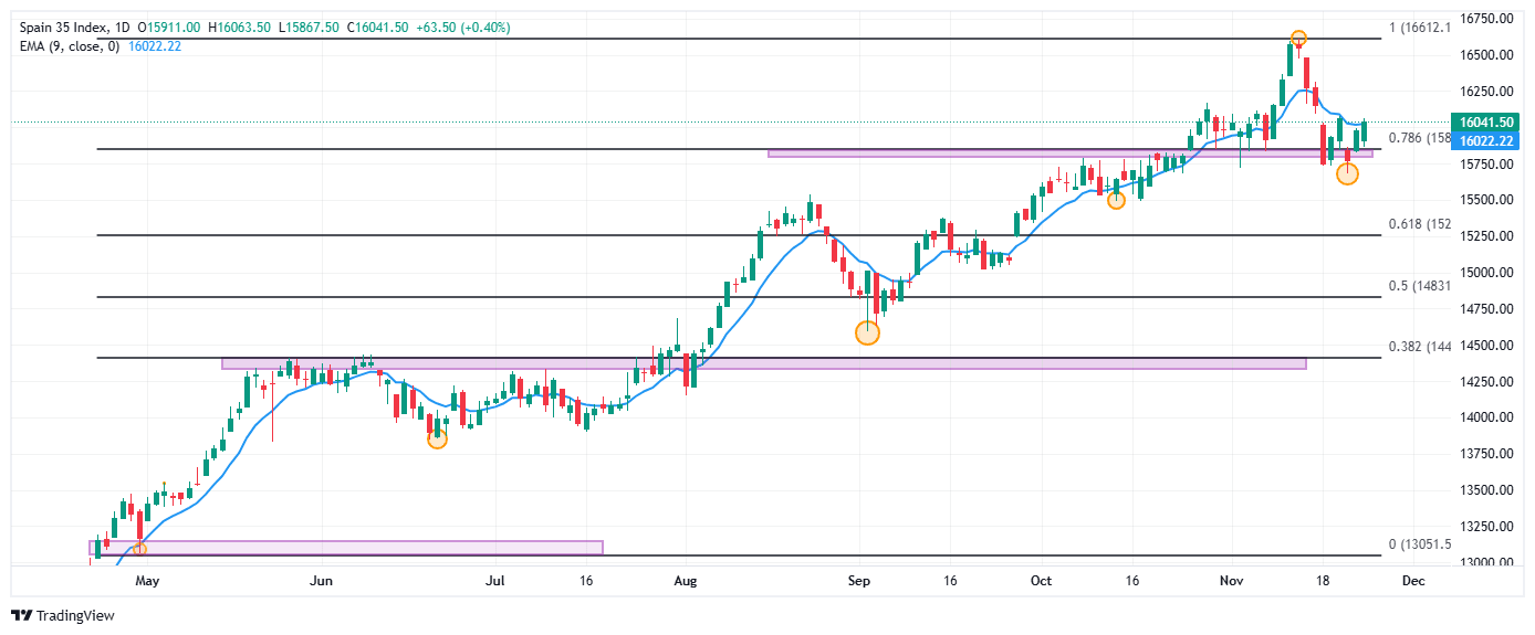El Ibex 35 reaccionó al alza desde un soporte de corto plazo en 15.828, mínimo del 21 de noviembre. El siguiente soporte clave está en 15.488, punto pivote del 14 de octubre. Al alza, la resistencia más cercana se encuentra en 16.610, máximo del 13 de noviembre.