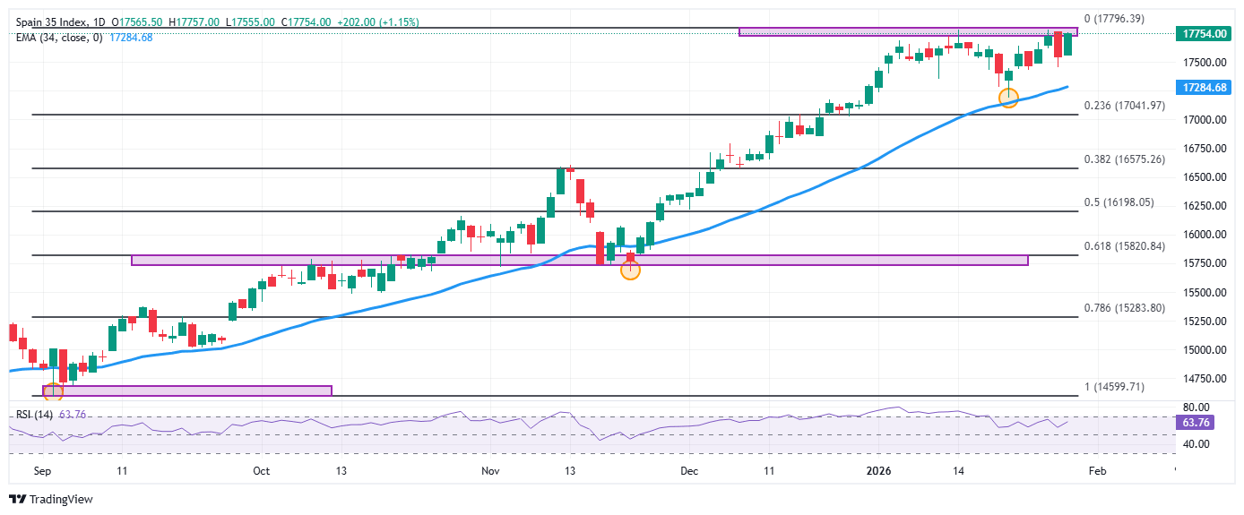 El Ibex 35 estableció un mínimo diario en 17.555, donde encontró compradores que impulsaron el índice a un máximo del día en 17.756. Al momento de escribir, el Ibex 35 opera sobre 17.751, subiendo un 1.12% en el día.