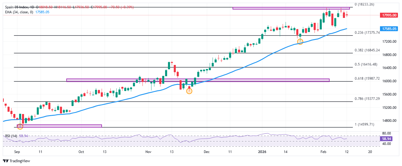 El Ibex 35 estableció un soporte de corto plazo en 17.191, dado por el mínimo del 21 de enero. El siguiente soporte importante lo observamos en 15.682, punto pivote del 21 de noviembre de 2025. Al alza, la resistencia más cercana se encuentra en 18.219, máximo histórico alcanzado el 3 de febrero.