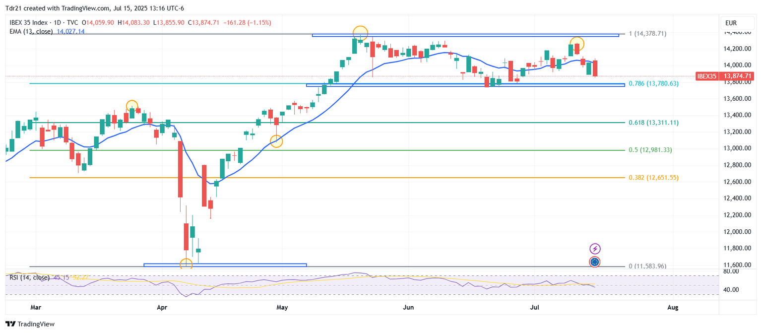 El Ibex 35 reaccionó a la baja desde máximos del 11 de julio en 14.083, donde encontró vendedores agresivos que arrastraron el índice a mínimos del 26 de junio en 13.855. Actualmente, el Ibex 35 opera sobre 13874, cayendo un 1.15% en la segunda jornada de la semana.