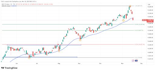 El Ibex 35 reaccionó la baja desde una resistencia de corto plazo dada por el máximo alcanzado el 13 de noviembre en 16.661. Al sur, el soporte más cercano se encuentra en 15.763, mínimo del 4 de noviembre. El siguiente soporte clave lo observamos en 14.646, punto pivote del 2 de septiembre, en convergencia con el promedio móvil exponencial de 34 períodos.