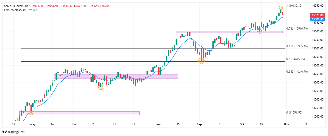 El Ibex 35 formó un soporte de corto plazo en 15.488, punto pivote del 14 de octubre. El siguiente soporte importante lo observamos en 14.591, mínimo del 2 de septiembre. Al norte, proyectamos una posible toma de ganancias en 17.000, número cerrado que converge con la extensión al 127.2% de Fibonacci.