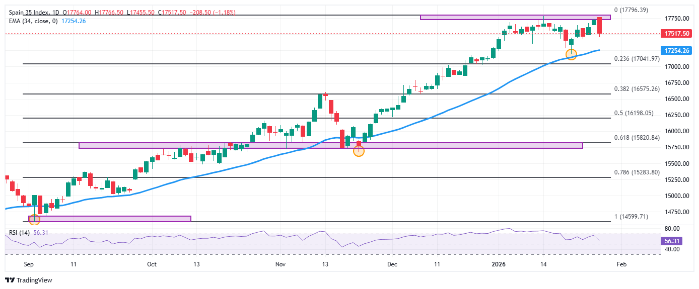 El Ibex 35 reaccionó a la baja desde un máximo del día en 17.766, atrayendo vendedores que lastraron el índice a mínimos del 23 de enero en 17.455. Al momento de escribir, el Ibex 35 cotiza en 17.486, cayendo un 1.36% en el día.