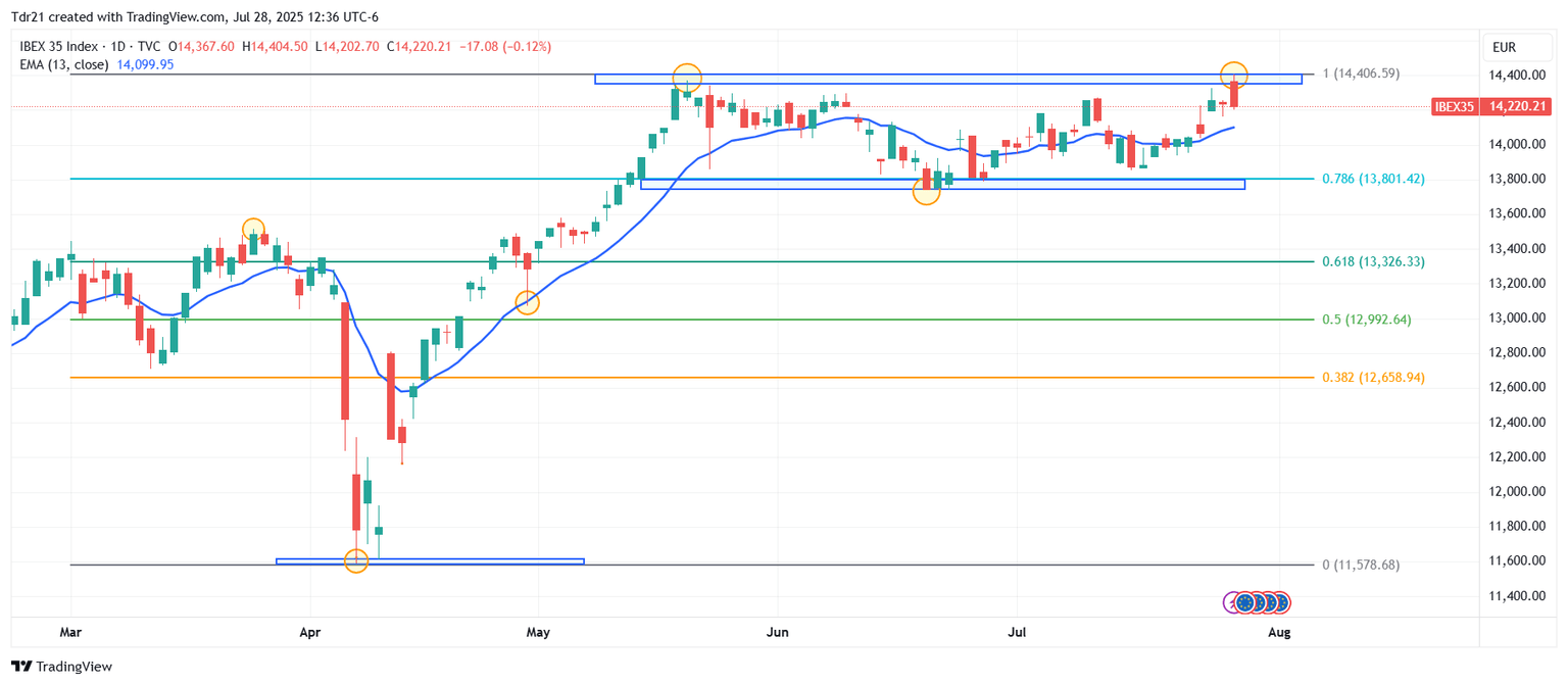 - El Ibex 35 cae un 0.12% diario, consolidándose dentro del rango operativo del 25 de julio en 14.220.