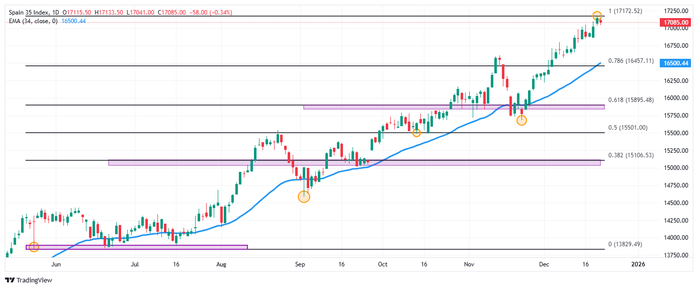 El Ibex 35 formó un soporte de corto plazo en 15.682, mínimo del 21 de noviembre. El siguiente soporte importante se encuentra en 15.488, punto pivote del 14 de octubre. Al alza, proyectamos una posible toma de ganancias en 17.500, número cerrado que converge con la extensión al 127.2% de Fibonacci.
