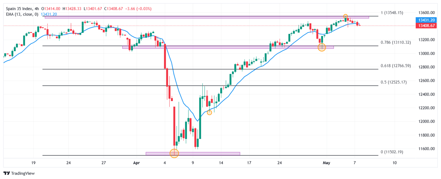 El Ibex 35 estableció una resistencia de corto plazo dada por el máximo del 6 de mato en 13.548. A la baja, el soporte más cercano lo observamos en 13.063, mínimo del 30 de abril, en convergencia con el retroceso al 78.6% de Fibonacci. El siguiente soporte clave se encuentra en 12.135, punto pivote del 10 de abril.
