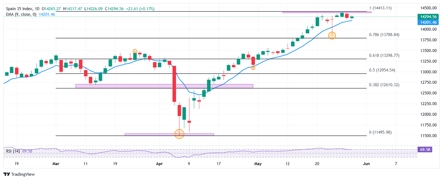 El Ibex 35 formó una resistencia de corto plazo dada por el máximo del 27 de mayo en 14.414. A la baja, el soporte más cercano está en 13.063, mínimo del 30 de abril, en convergencia con el promedio móvil exponencial de 9 periodos. El siguiente soporte importante se encuentra en 11.500, punto pivote del 7 de abril.