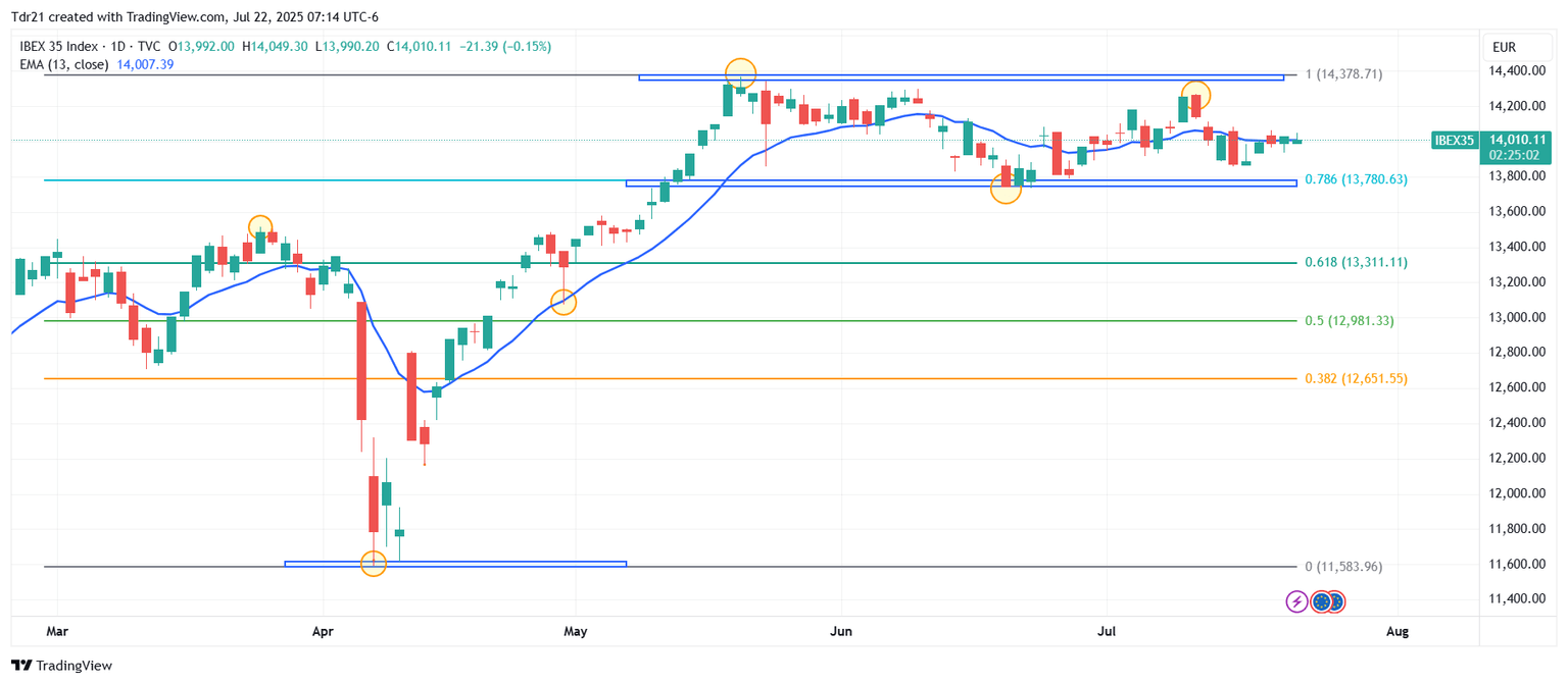 - El Ibex 35 retrocede un 0.23% diario, consolidándose dentro del rango operativo del 21 de julio en 13.998.