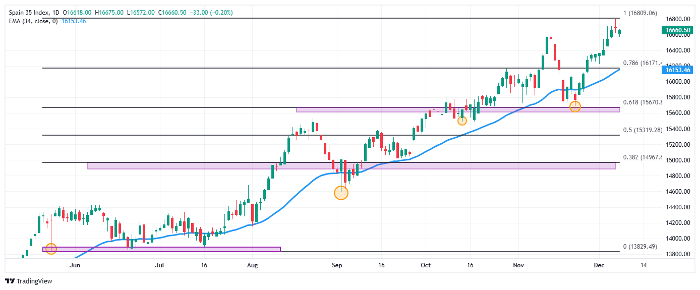 El Ibex 35 formó un soporte de corto plazo en 15.828, mínimo del 21 de noviembre. El siguiente soporte importante está en 15.488, punto pivote del 14 de octubre. Al alza, proyectamos una posible toma de ganancias en 17.500, número cerrado que converge con la extensión al 127.2% de Fibonacci.