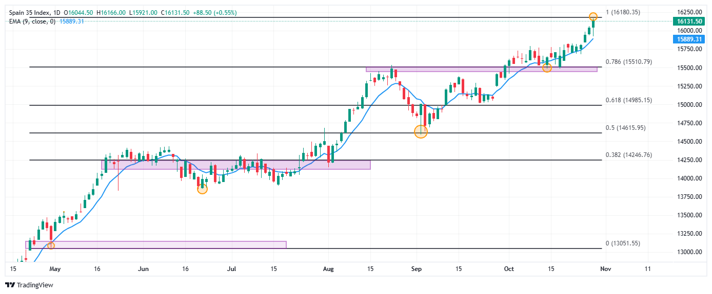 - El Ibex 35 repunta 0.52% en el día, marcando nuevos máximos históricos en 16.166.