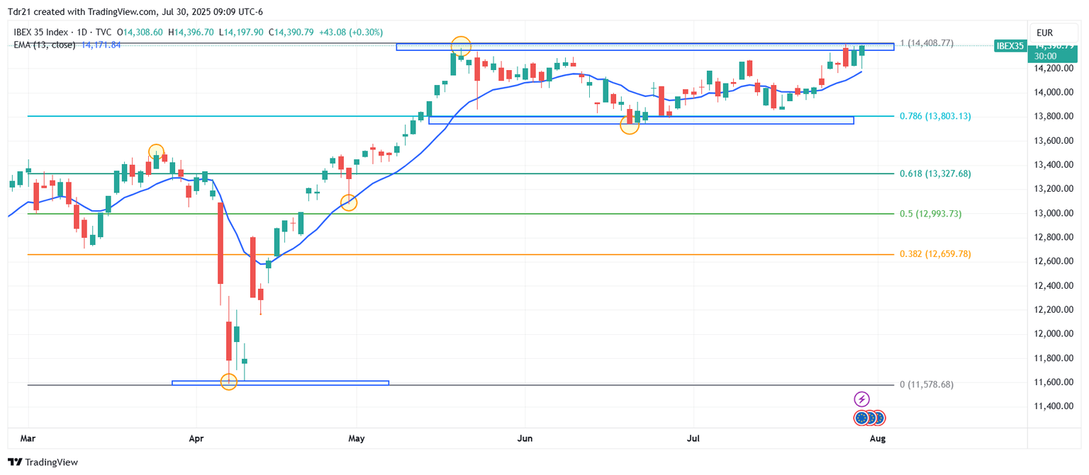 El Ibex 35 reaccionó al alza desde mínimos del 25 de julio en 14.197, Encontrando compradores que llevaron el índice a un máximo del día en 14.384. Actualmente, el Ibex 35 opera sobre 14.391, ganando un 0.31% el día de hoy.