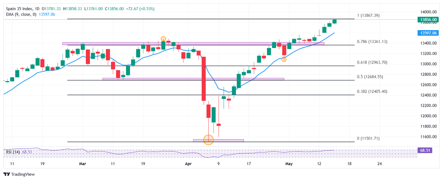 El Ibex 35 marcó un mínimo diario en 13.761, atrayendo compradores que impulsaron el índice a máximos del 23 de mayo de 2008 en 13.852. Actualmente, el Ibex 35 opera en 13.841, ganando un 0.44%. el día de hoy.