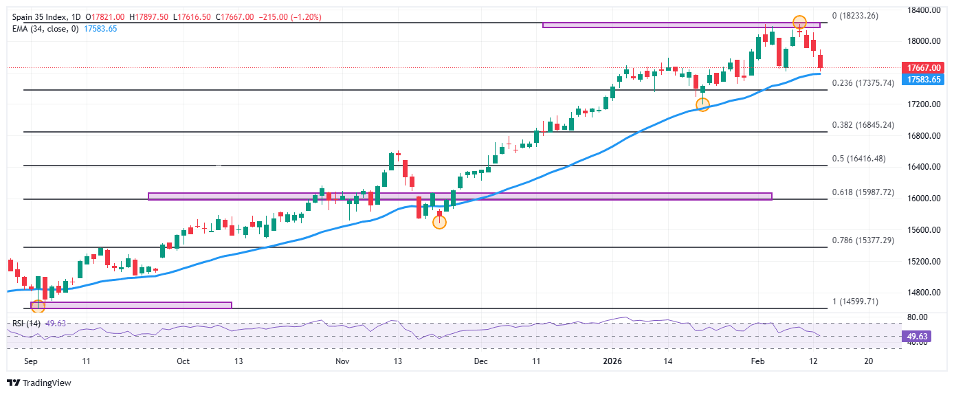 El Ibex 35 formó un soporte de corto plazo en 17.191, dado por el mínimo del 21 de enero. El siguiente soporte importante lo observamos en 15.682, punto pivote del 21 de noviembre de 2025. Al alza, la resistencia más cercana se encuentra en 18.219, máximo histórico alcanzado el 3 de febrero.