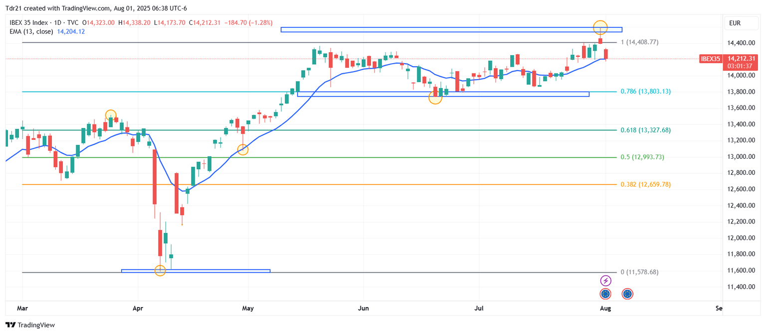 - El Ibex 35 retrocede un 1.34% diario, llegando a mínimos del 30 de julio en 14.173.