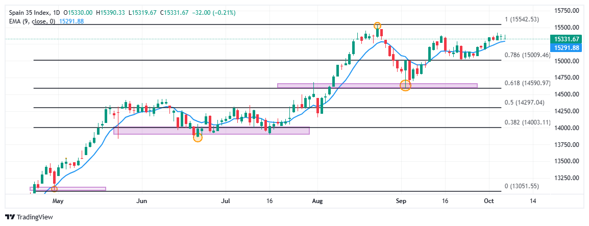 El Ibex 35 reaccionó al alza desde 14.591, mínimo del 2 de septiembre. El siguiente soporte importante está en 13.849, mínimo del 19 de junio, cercano al retroceso al 38.2% de Fibonacci. Al norte, la resistencia más cercana se encuentra en 15.538, punto pivote del 22 de agosto.