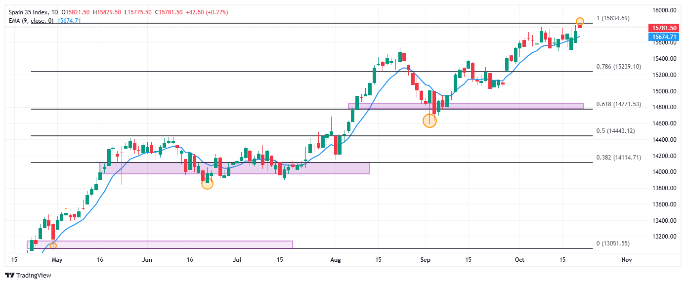 El Ibex 35 reaccionó a la baja desde máximos no vistos desde el 12 de diciembre de 2007 en 15.829, encontrando vendedores que llevaron el índice a un mínimo diario en 15.775. Actualmente, el Ibex 35 opera sobre 15.782, ganando un 0.27% el día de hoy.