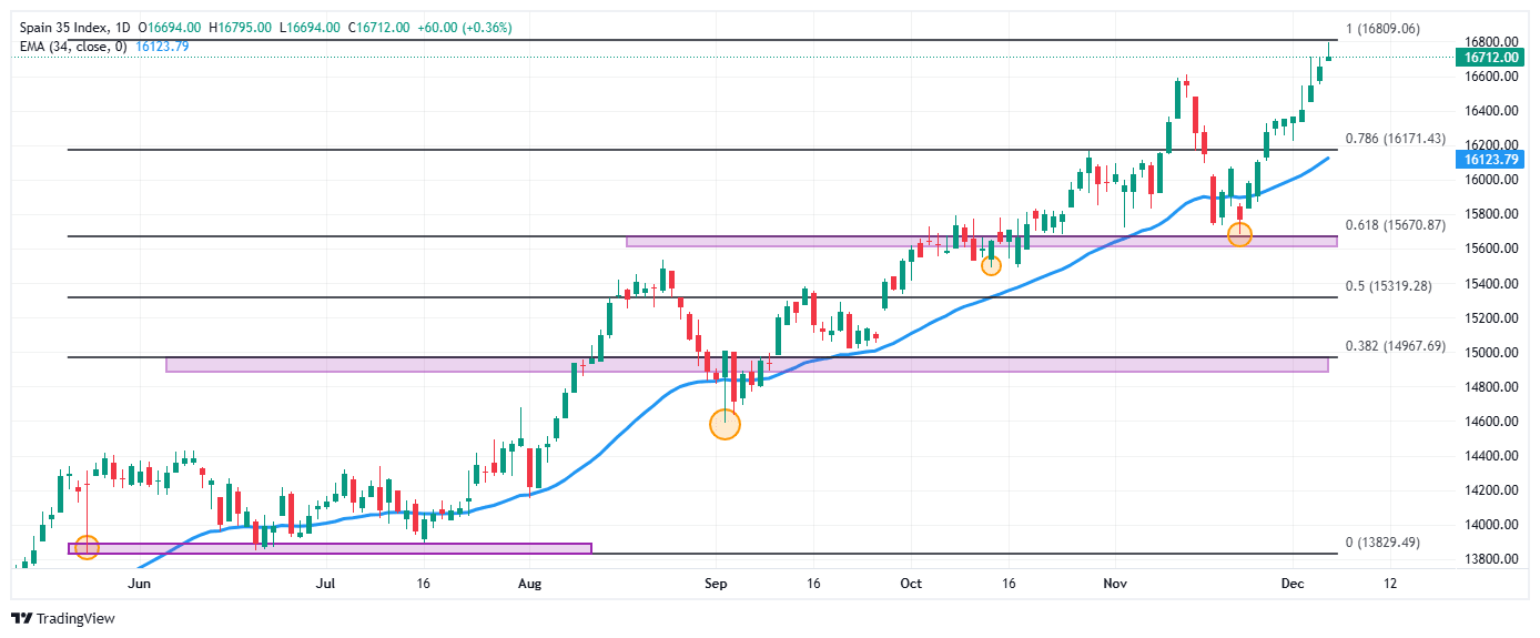 En este contexto, el Ibex 35 repunta 59 puntos, estableciendo un nuevo máximo histórico en 16.795.