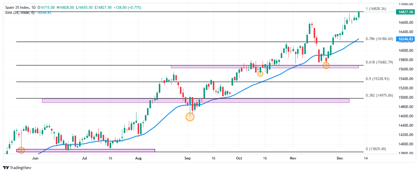 - El Ibex 35 repunta 0.66% en la jornada del jueves, registrando un nuevo máximo histórico en 16.828.