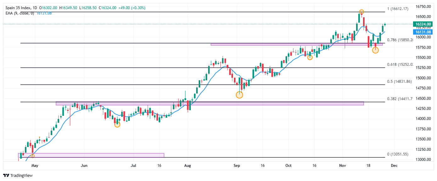 El Ibex 35 reaccionó al alza desde un soporte de corto plazo en 15.828, mínimo del 21 de noviembre. El siguiente soporte clave está en 15.488, punto pivote del 14 de octubre. Al alza, la resistencia más cercana se encuentra en 16.610, máximo del 13 de noviembre.