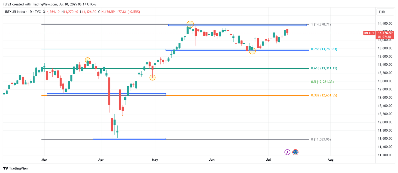 El Ibex 35 se mantiene un rango lateral entre un soporte de corto plazo dado por el mínimo del 23 de junio en 13.737 y el máximo del 21 de mayo en 14.368. Al sur, el soporte clave está en 13.074, punto pivote del 30 de abril, en convergencia con el promedio móvil exponencial de 9 periodos.