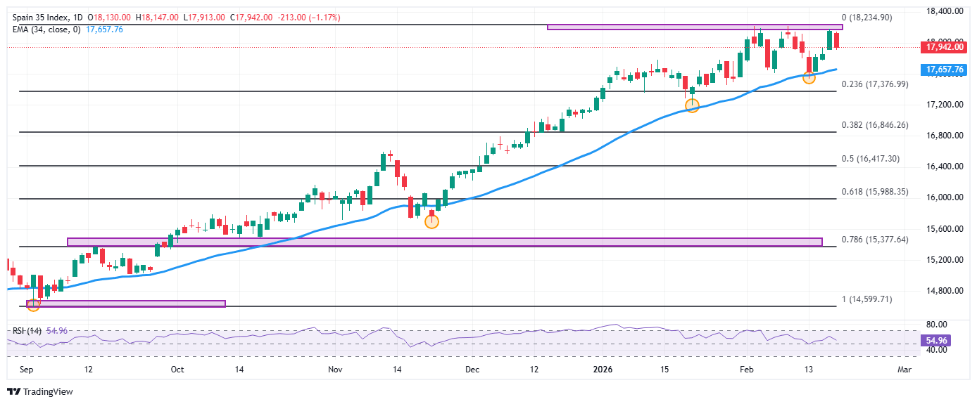 El Ibex 35 formó un soporte de corto plazo en 17.191, dado por el mínimo del 21 de enero. El siguiente soporte importante lo observamos en 15.682, punto pivote del 21 de noviembre de 2025. Al alza, la resistencia más cercana se encuentra en 18.219, máximo histórico alcanzado el 3 de febrero.