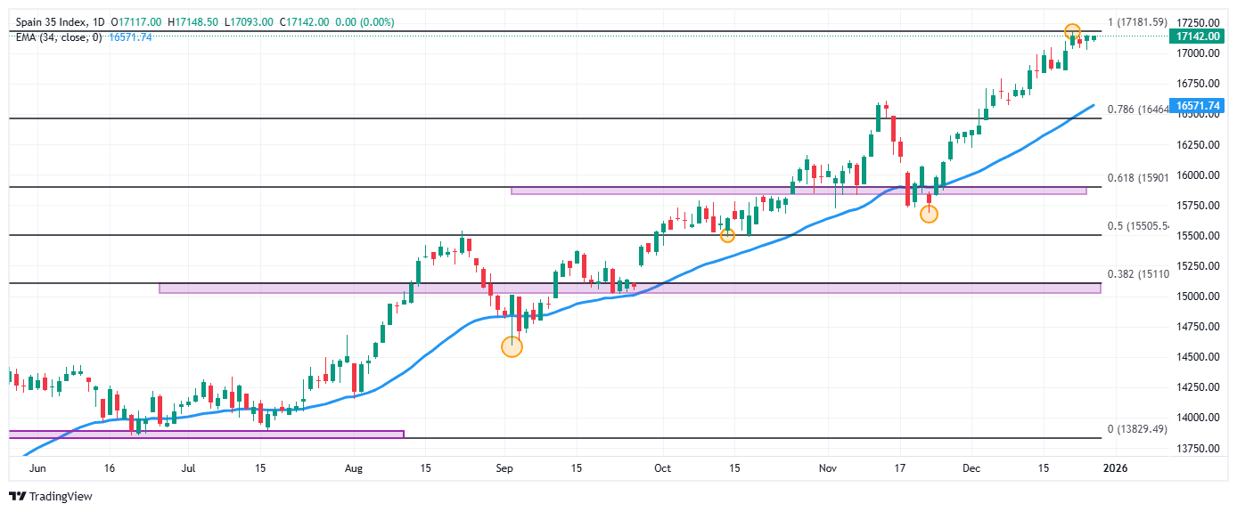 En otro frente, el Instituto Nacional de Estadística de España publicará el día de mañana el Índice preliminar de Precios de Consumo Armonizado correspondiente a diciembre. El consenso de analistas espera que se sitúe en un 3%, ligeramente por debajo del 3.2% observado en el periodo anterior. De igual forma, se contempla la variación en el desempleo y el PMI Manufacturero de HCOB de diciembre, ambos a darse a conocer el viernes 2 de enero.