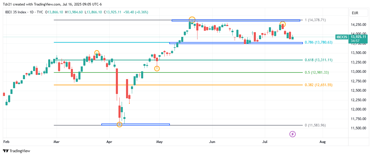 El Ibex 35 oscila en un rango lateral entre un soporte de corto plazo dado por el mínimo del 23 de junio en 13.737 y el máximo del 21 de mayo en 14.368. A la baja, el soporte clave está en 13.074, punto pivote del 30 de abril, en convergencia con el promedio móvil exponencial de 13 periodos.