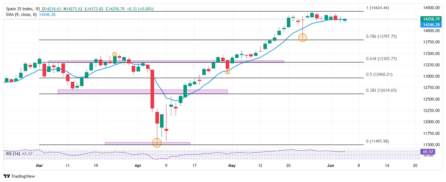 El Ibex 35 estableció una resistencia de corto plazo dada por el máximo del 27 de mayo en 14.414. A la baja, el soporte más cercano está en 13.832, mínimo del 23 de abril. El siguiente soporte importante se encuentra en 13.063, punto pivote del 30 de abril que converge con el promedio móvil exponencial de 9 periodos.